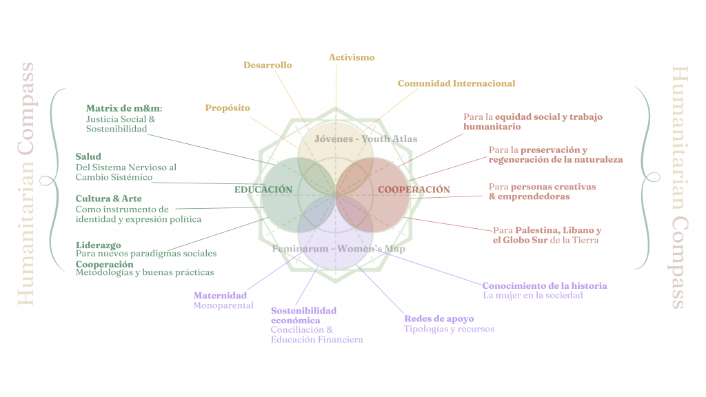 WORKSHOPS: Los talleres educativos que ofrecemos son parte de una programación que incluye la matriz de 13 temas relacionados con la Justicia Social, la Educación Global y la Sostenibilidad, un enfoque sistémico de Salud, Cultura y Arte como identidad, entre otros especificados en el Area de Educación. - COMMUNITIES: