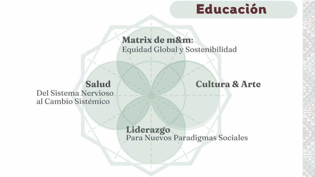 Nuestro enfoque integra cuatro pilares interconectados. La Plataforma Matrix ofrece un marco para la equidad global y el desarrollo sostenible, ayudando a personas y comunidades a comprender la complejidad, la interdependencia y la toma de decisiones éticas. Salud, desde la regulación del sistema nervioso hasta el cambio sistémico, explora cómo el bienestar individual y la resiliencia colectiva están profundamente conectados. Arte y Cultura se reconocen como fuerzas esenciales para la sanación, la expresión y el crecimiento humano. Por último, Liderazgo para nuevos paradigmas prepara a las personas para habitar la incertidumbre y los procesos de transición con ética, empatía y propósito.